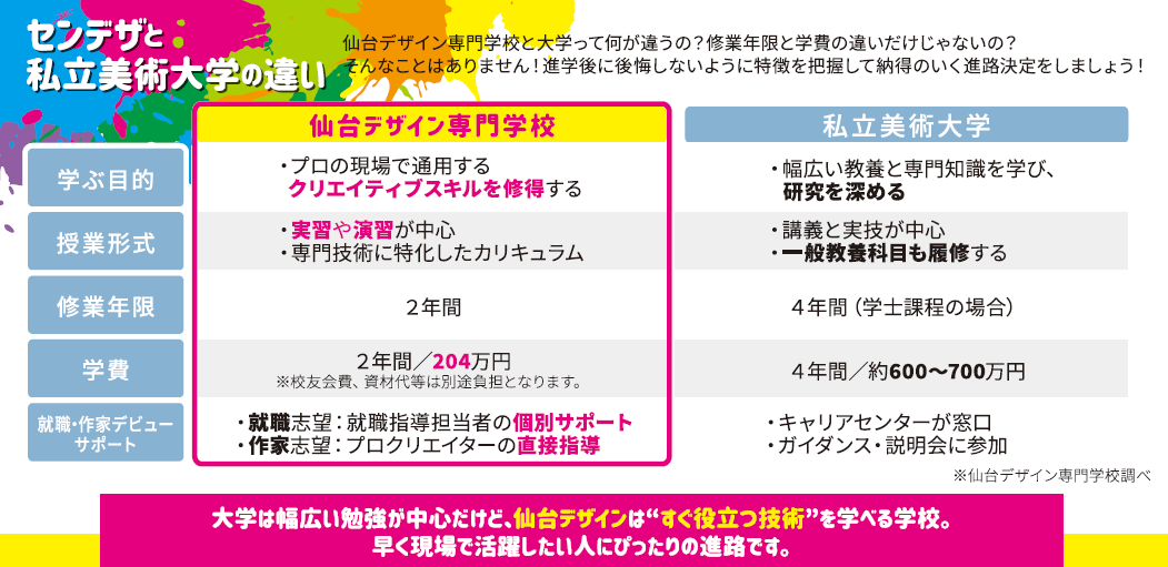 特に、将来やりたいことがはっきりしている人や、「早く社会で活躍したい」「手に職をつけたい」と考えている人にとって、専門学校は最短ルートになり得ます。現場で活躍する講師から学び、即戦力を磨けるため、卒業後すぐに業界で活躍している卒業生も多くいます。